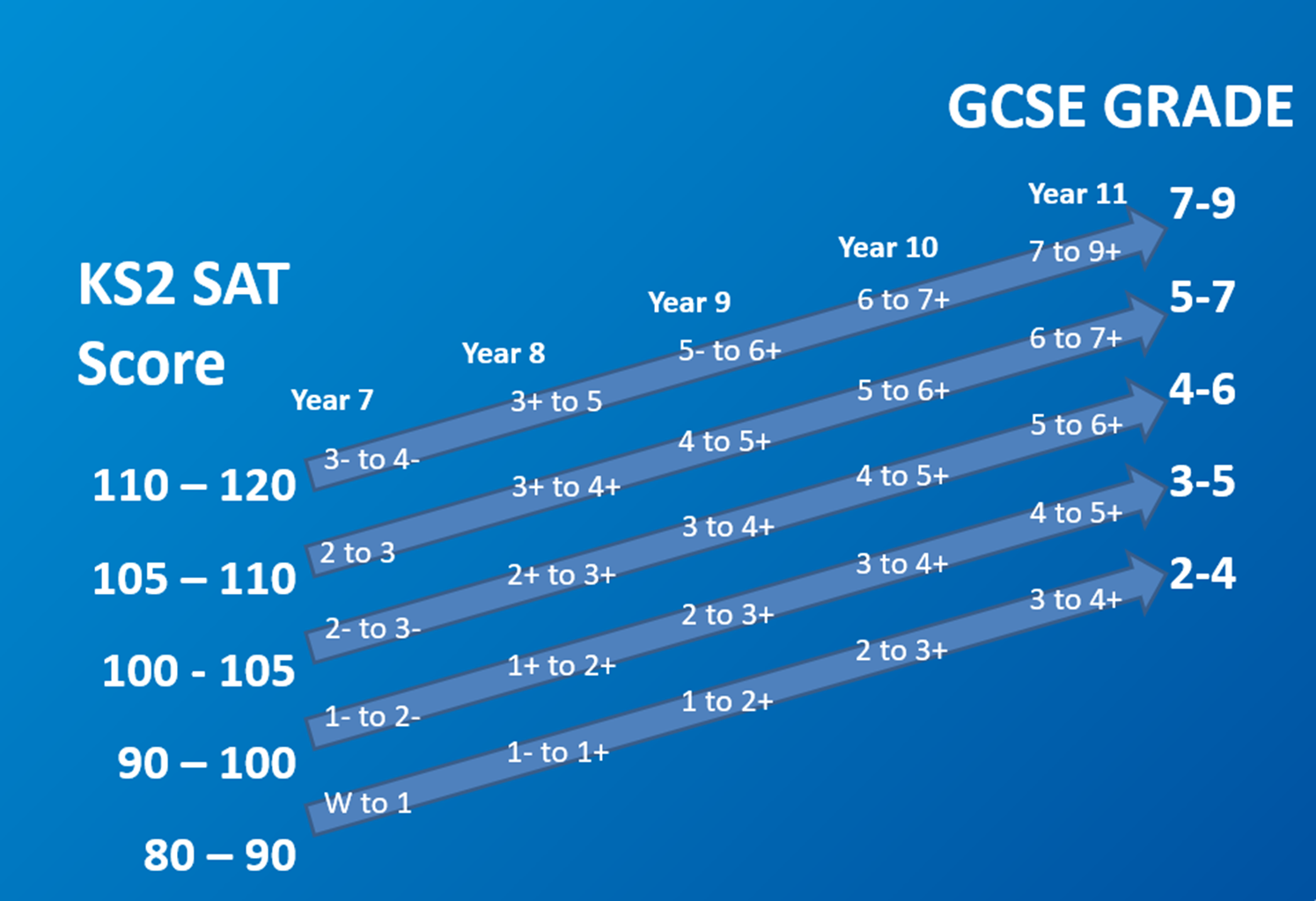 The target is generated by a national organisation we work with called FFTaspire. They look at each KS2 SAT score and look at the most common GCSE outcome for students at the end of KS4 with that score. They then use this to estimate end of KS4 targets for students who have KS2 SAT scores but have not reach KS4 yet. Most secondary schools use this. We take this target and break it into roughly fifths. Each year a fifth is added until the whole target is reached in year 11. The numbers translate in to GCSE scores so students can see what grade they are on track to achieve at the end of year 11.